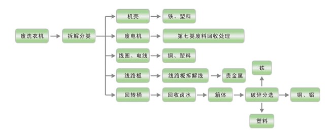 ⑴.人工處理。 a.抽取制冷氣體。由于制冷氣體為有害氣體。所以先用專用設(shè)備將其抽取儲(chǔ)存,當(dāng)收集到一定數(shù)量時(shí)再送到資質(zhì)單位集中處理。 b.拆除壓縮機(jī). c.拆除散熱器,不銹鋼片。 d.拆除電線等。 ⑵.冰箱主體部份經(jīng)輸送機(jī)送到一次破碎機(jī),先粉碎到一定大小。 ⑶.經(jīng)一次破碎機(jī)破碎后的物料再送到二次粉碎機(jī),粉碎后金屬與非金屬完全分離。 ⑷.磁選采用滾筒式磁選器將磁性金屬分離出來(lái)。 ⑸.再用渦電流分選機(jī)將塑料、各有色金屬分離。 ⑹.聚氨酯泡末通過(guò)減容壓縮機(jī)打包回收,溢出發(fā)泡劑由發(fā)泡回收機(jī)回收 ⑺.全程通過(guò)脈沖除塵裝置集塵,并通過(guò)活性炭吸附排出干凈空氣。
