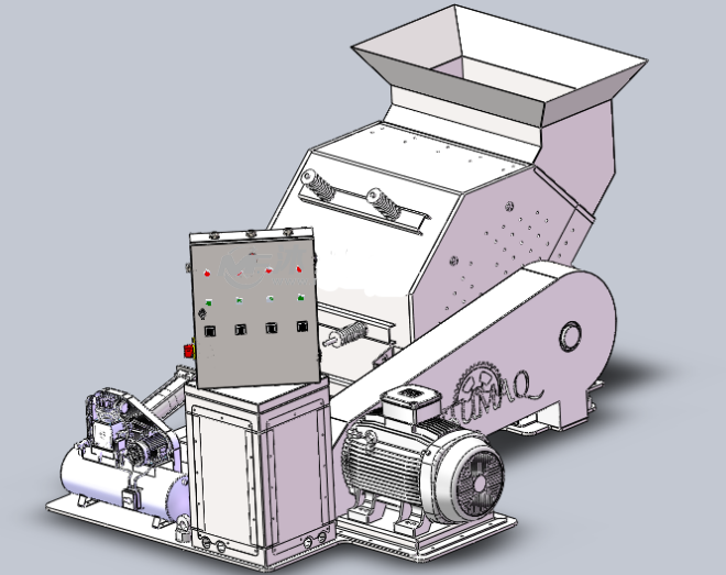 金屬粉碎機(jī)在設(shè)備構(gòu)造上主機(jī)殼體采用用特厚鋼板制造,內(nèi)襯為高錳鑄鋼件以起到保護(hù)外機(jī)體的作用,在主機(jī)轉(zhuǎn)子部位該機(jī)采用盤式緊固旋轉(zhuǎn)機(jī)構(gòu),在轉(zhuǎn)子上有若干個(gè)鋼盤安裝于水平軸上(鋼盤數(shù)量及直徑依據(jù)型號(hào)),鋼盤圓周分布有6根銷軸,軸向懸有若干個(gè)錘頭用于對(duì)物料進(jìn)行擊打破碎,主軸用滾珠軸承支承,循環(huán)油強(qiáng)制潤(rùn)滑冷卻,并裝有溫度傳感器以保證設(shè)備高速穩(wěn)定運(yùn)行,通過以上機(jī)殼與主軸的配合來完成金屬的粉碎作業(yè)。