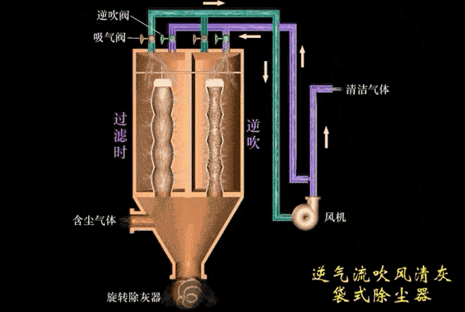 袋式除塵器高的除塵效率是與它的除塵機(jī)理分不開的。含塵氣體由除塵器下部進(jìn)氣管道,經(jīng)導(dǎo)流板進(jìn)入灰斗時(shí),由于導(dǎo)流板的碰撞和氣體速度的降低等作用,粗粒粉塵將落入灰斗中,其余細(xì)小顆粒粉塵隨氣體進(jìn)入濾袋室,由于濾料纖維及織物的慣性、擴(kuò)散、阻隔、鉤掛、靜電等作用,粉塵被阻留在濾袋內(nèi),凈化后的氣體逸出袋外,經(jīng)排氣管排出。濾袋上的積灰用氣體逆洗法去除,清除下來的粉塵下到灰斗,經(jīng)雙層卸灰閥排到輸灰裝置。濾袋上的積灰也可以采用噴吹脈沖氣流的方法去除,從而達(dá)到清灰的目的,清除下來的粉塵由排灰裝置排走。袋式除塵器的除塵效率高也是與濾料分不開的,濾料性能和質(zhì)量的好壞,直接關(guān)系到袋式除塵器性能的好壞和使用壽命的長短。而過濾材料是制作濾袋的主要材料,它的性能和質(zhì)量是促進(jìn)袋式除塵技術(shù)進(jìn)步,影響其應(yīng)用范圍和使用壽命。